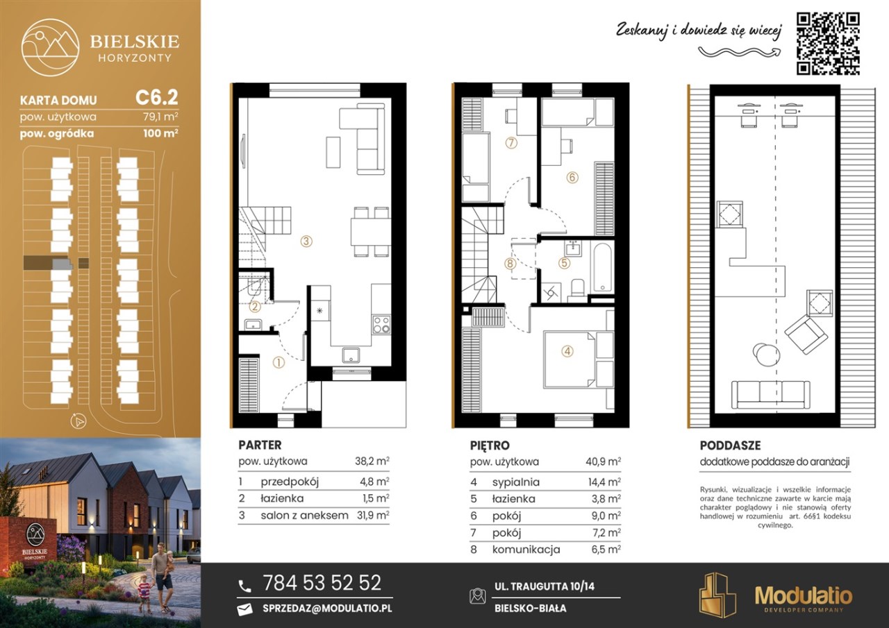 „Bielskie Horyzonty” to nowoczesne osiedle obejmujące 40 domów w zabudowie bliźniaczej, zlokalizowane w kameralnej dzielnicy Bielska-Białej. Inwestycja oferuje komfortowe lokale o powierzchni od 73,5 m² do 88,1 m² z prywatnymi ogródkami od 32 m² do aż 172 m².