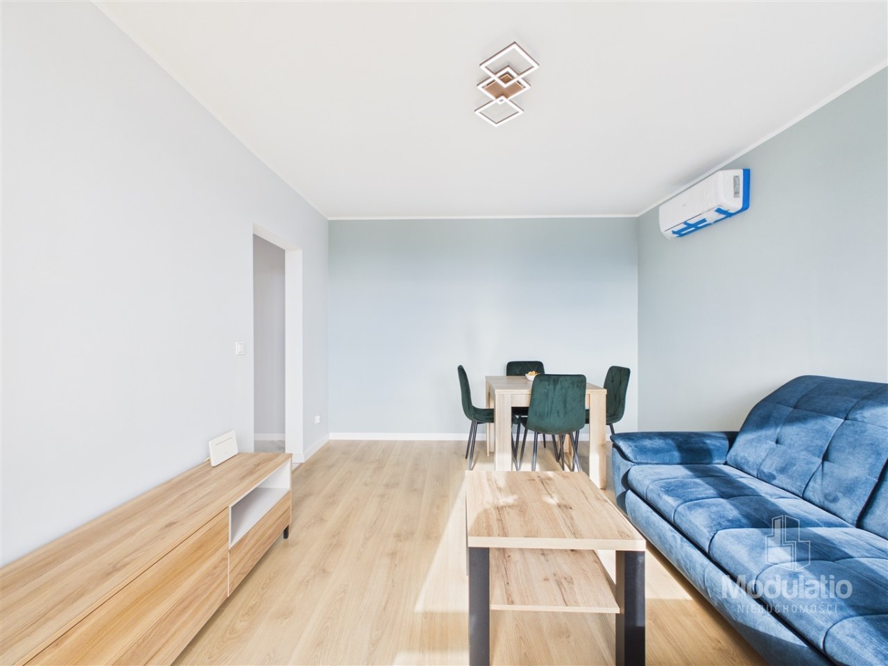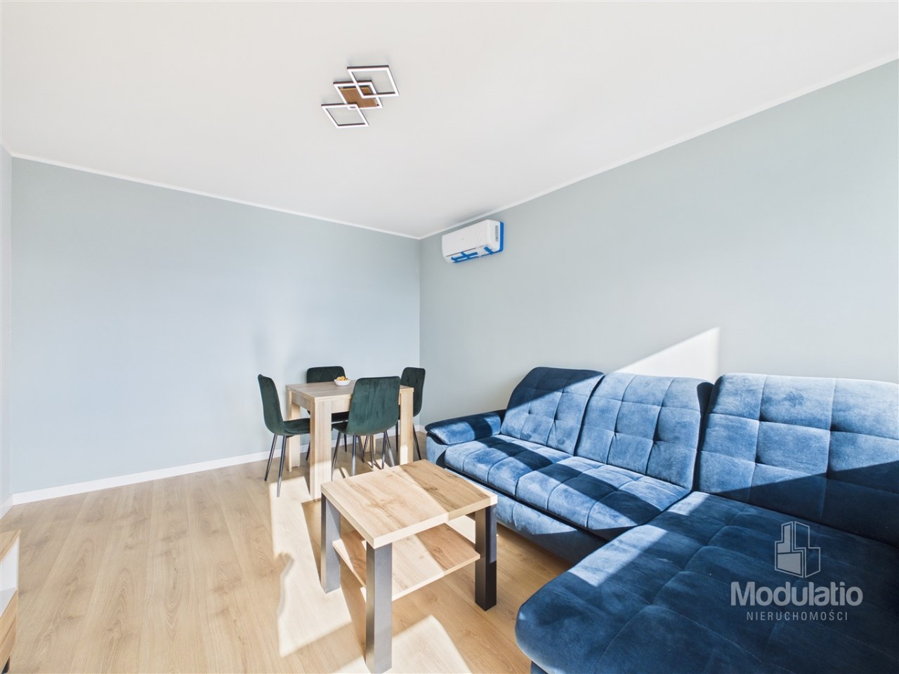 częściowe umeblowanie: kanapa, stół z krzesłami, ścianka RTV